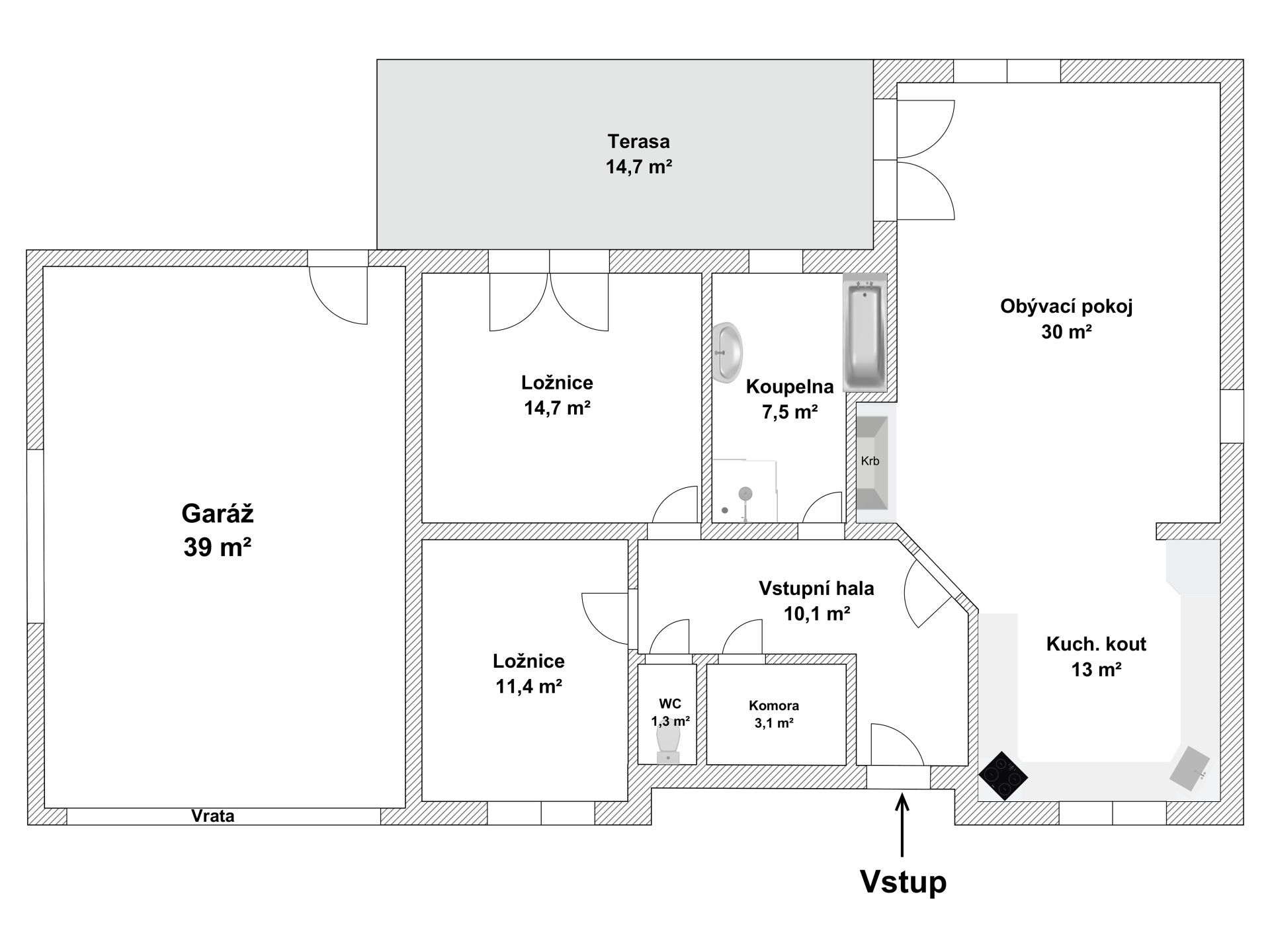 - Prostorná garáž: 39 m² pro 2 vozy, technická místnost, nad garáží pochozí půda