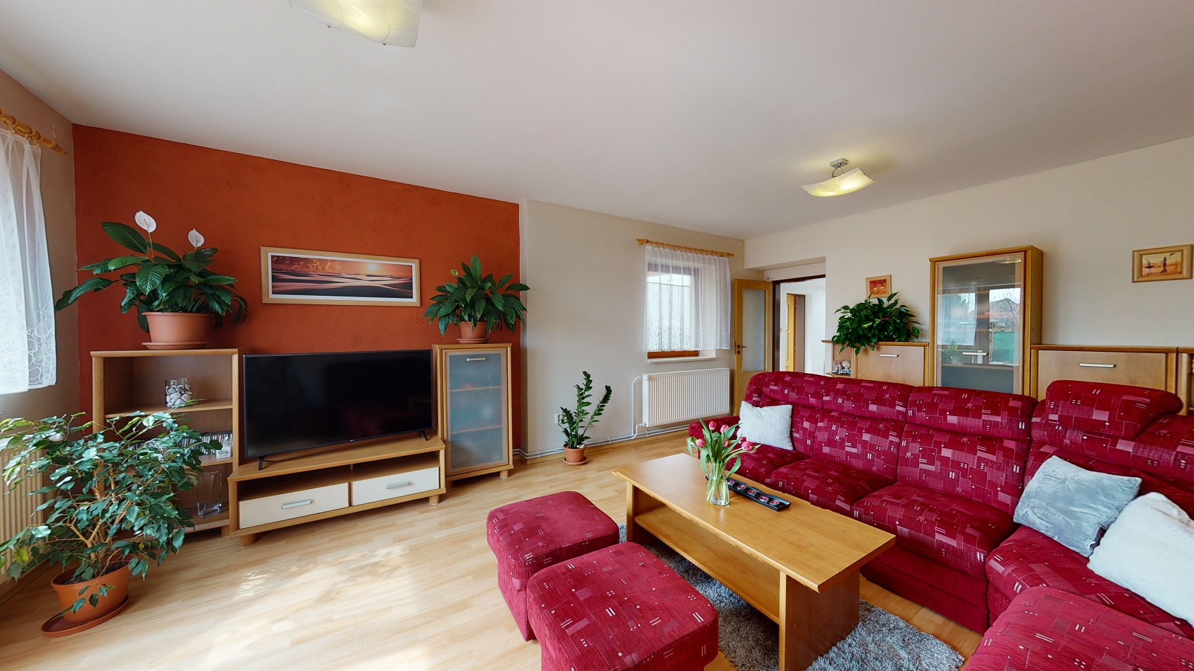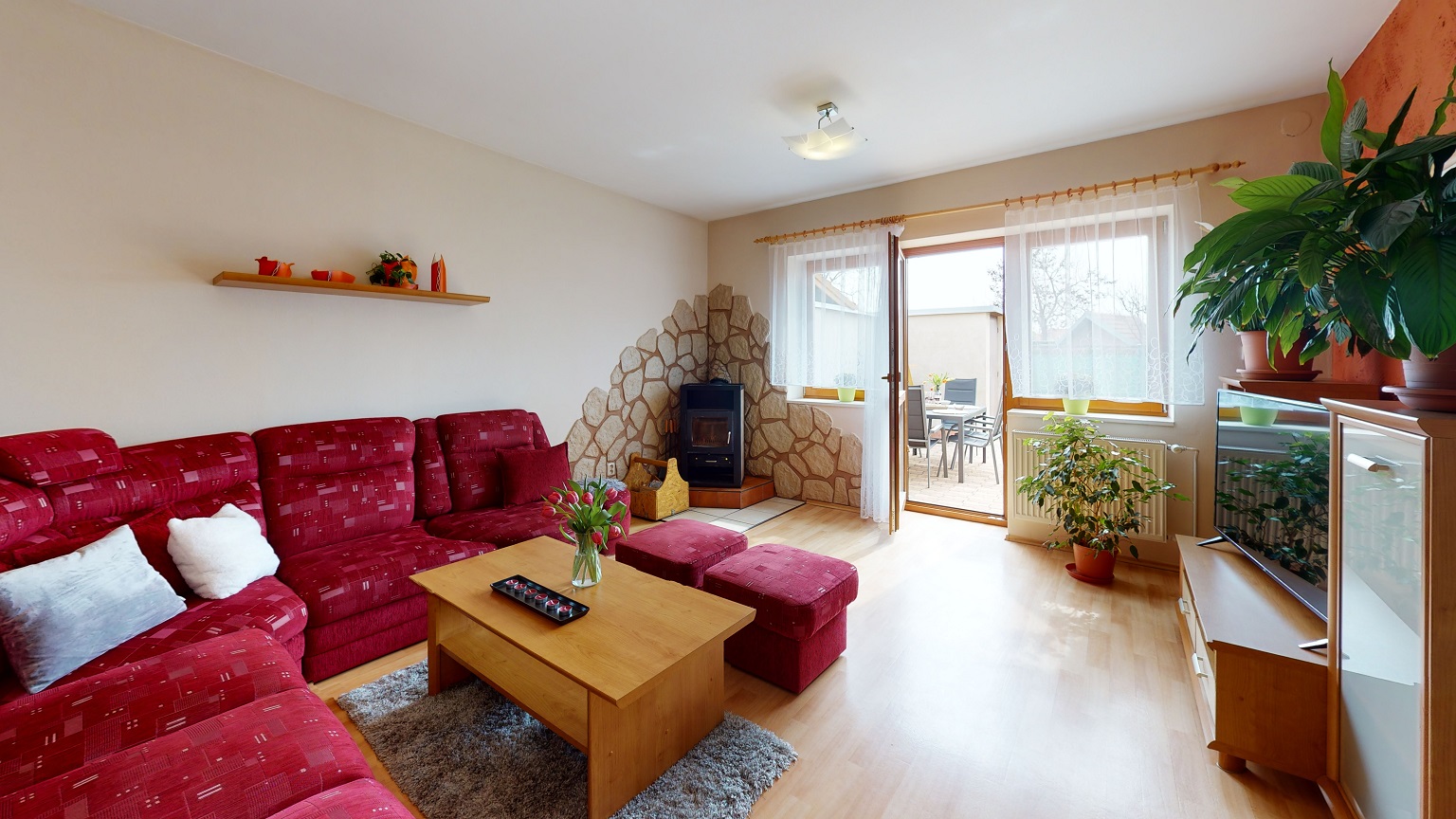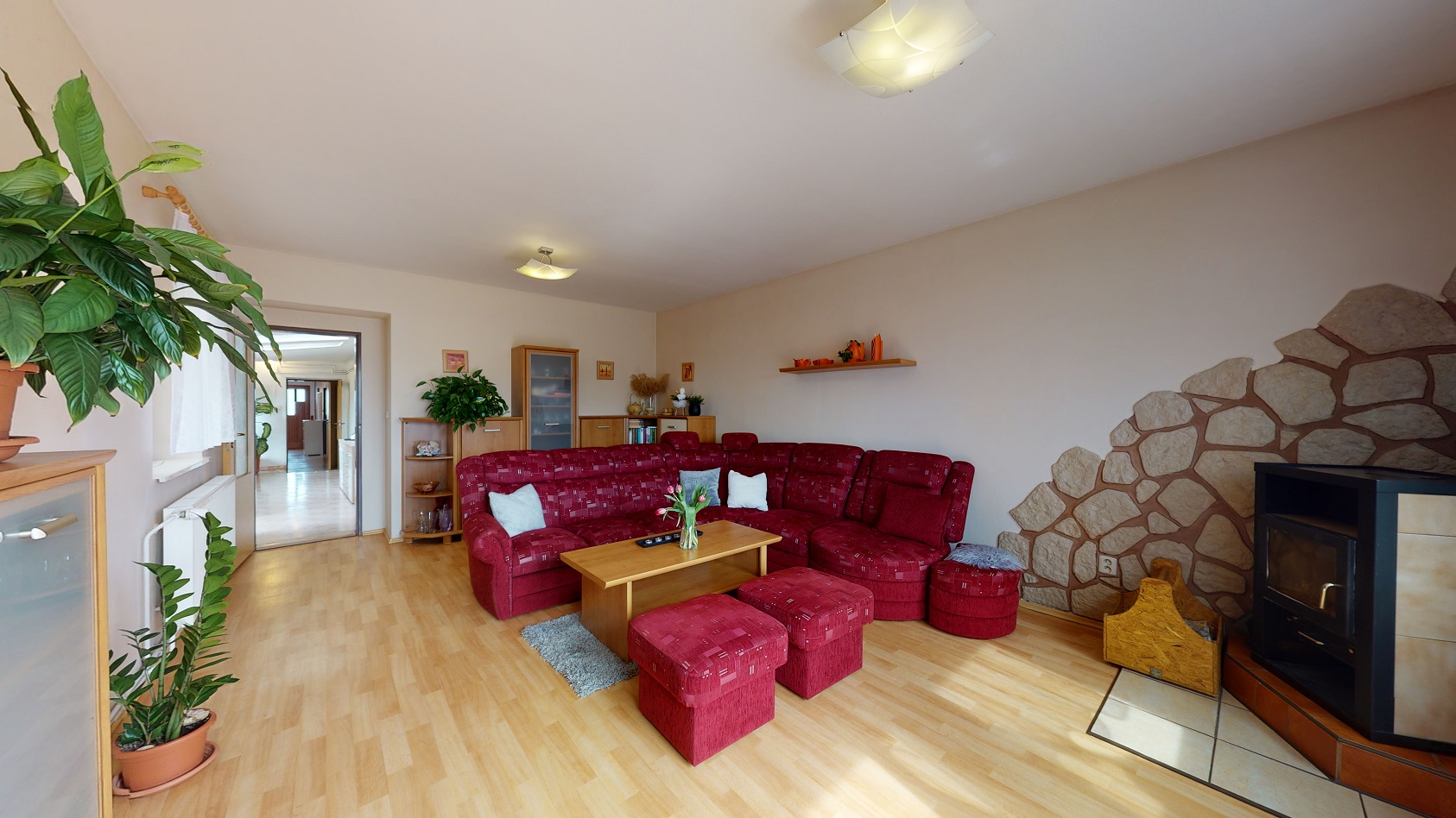 Dům je v hezkém a udržovaném stavu a je vhodný k okamžitému nastěhování bez nutnosti dalších úprav či rekonstrukce. V interiéru najdete dostatek prostoru i soukromí. Velkou výhodou je zde samostatná kuchyně se spotřebiči a oknem, velkorysý obývací pokoj s krbem, který je umístěný přímo u vchodu na zahradu. Jsou zde dále tři opravdu velké pokoje, koupelna s vanou a sprchovým koutem a také samostatná toaleta. Rozměry jednotlivých obytných místností včetně technické místnosti a komory, která je také součástí interiéru najdete v přiloženém 3D půdorysu.