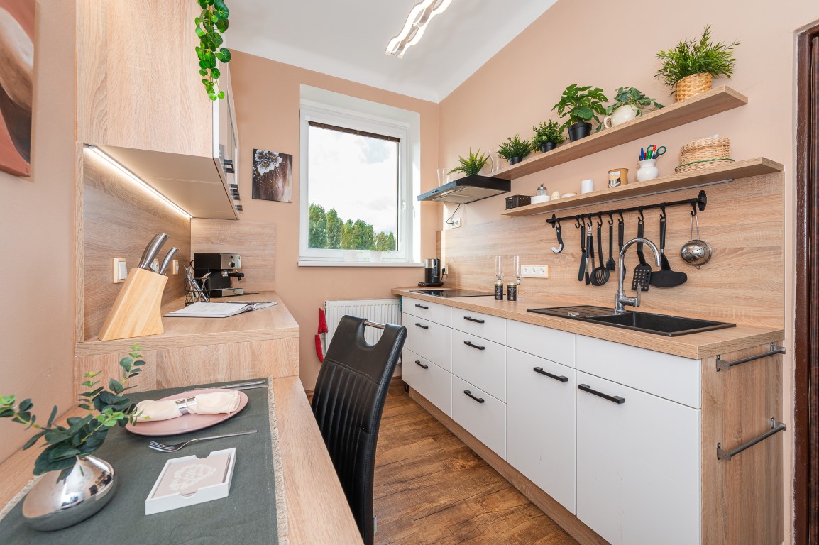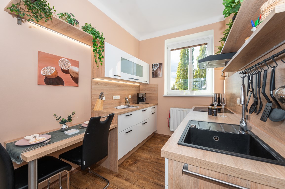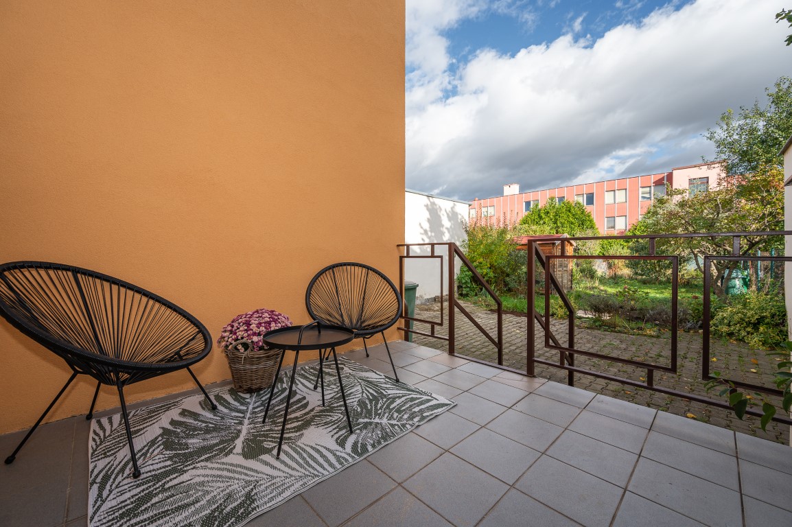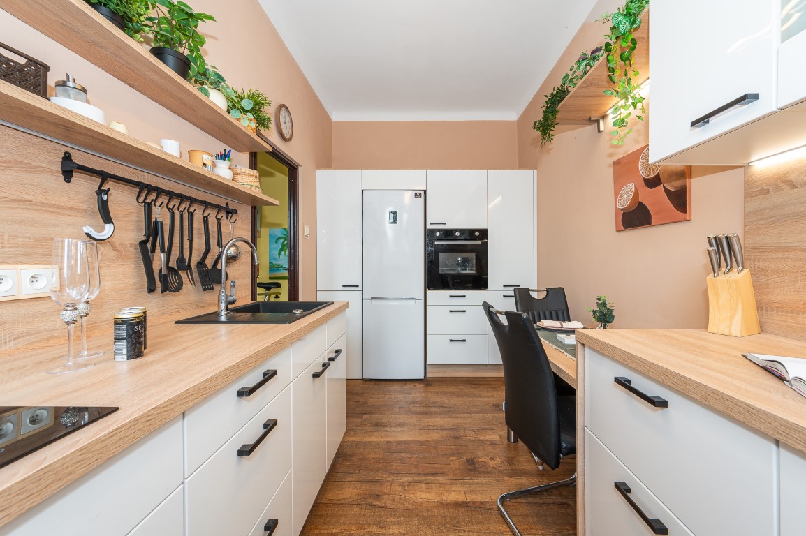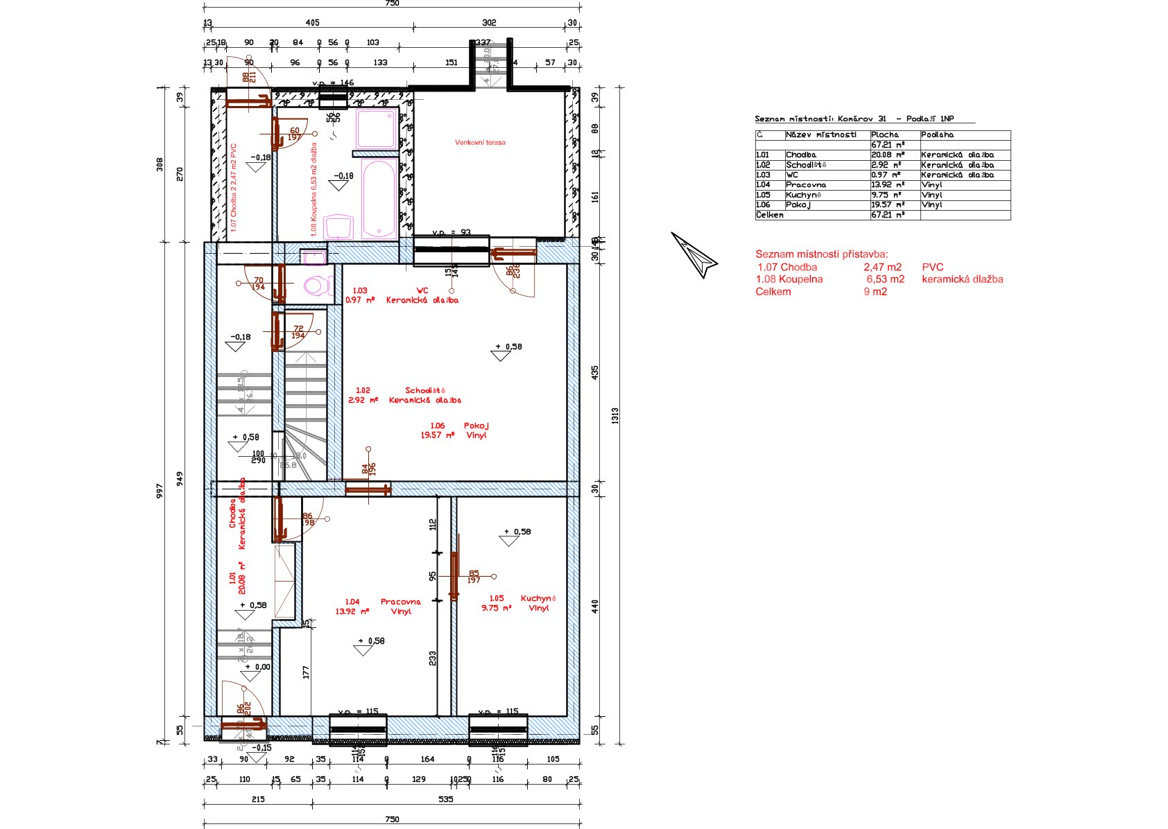 V 1.NP jsou dva pokoje se vstupem na terasu a nová kuchyně. Podlahy jsou vinylové a plovoucí, na chodbě dlažba.