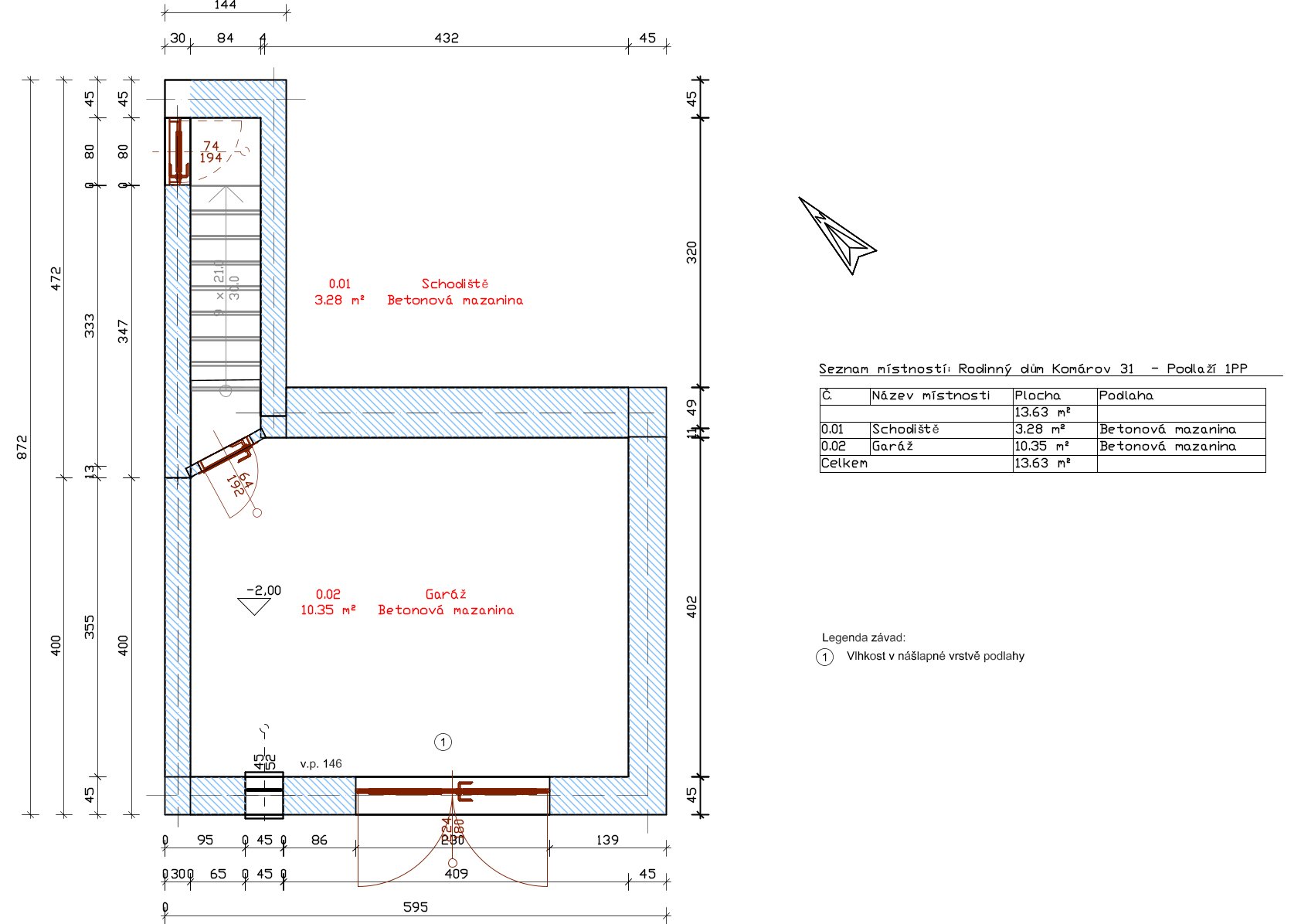V suterénu garáž, podlahová plocha činí 13,63 m2.