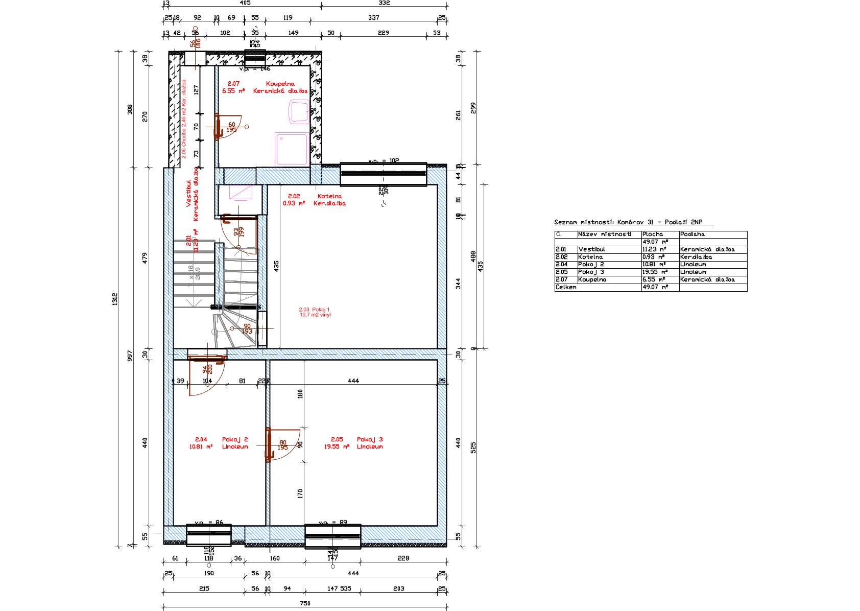 V 2.NP je ložnice s vestavnými skříněmi, dva pokoje, technická místnost a nová koupelna se sprchovým koutem a WC. Obytná plocha 49,07 m2.