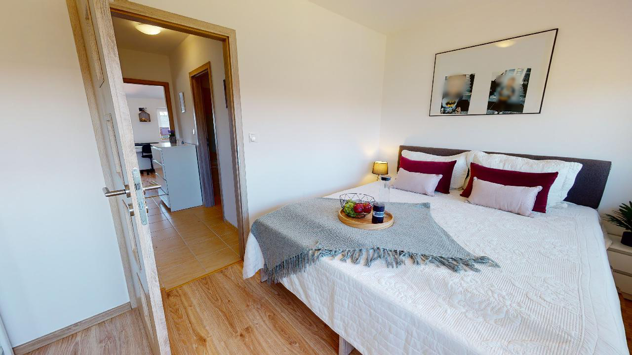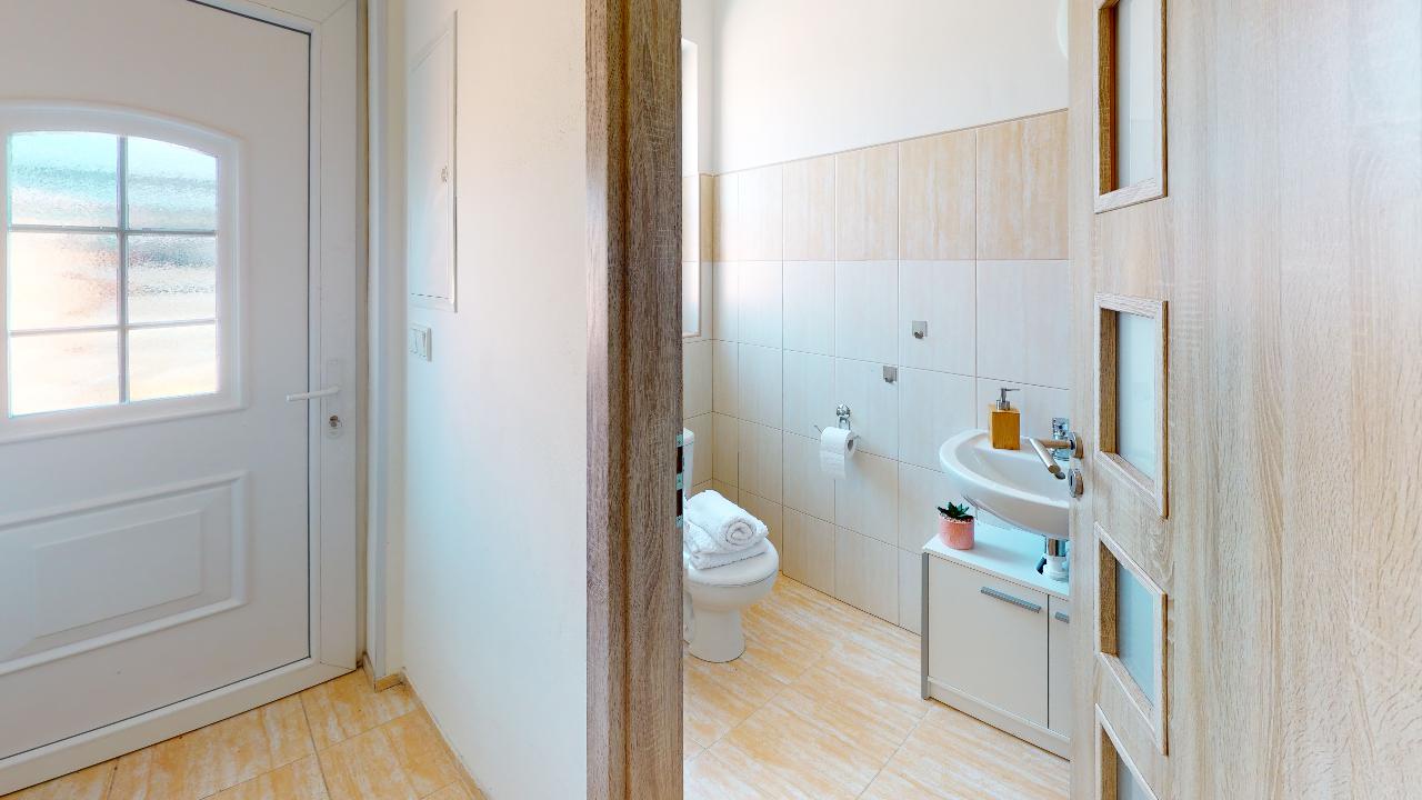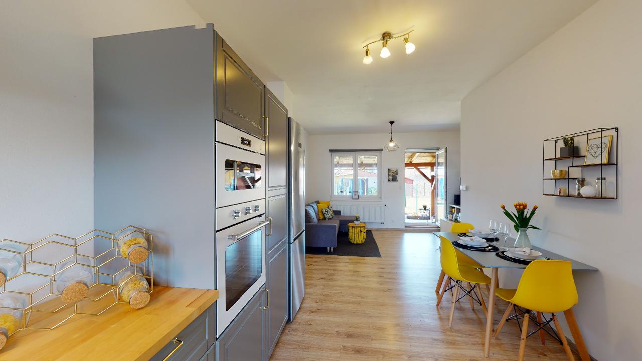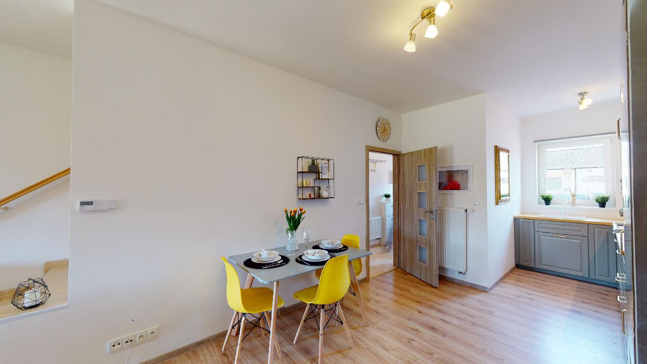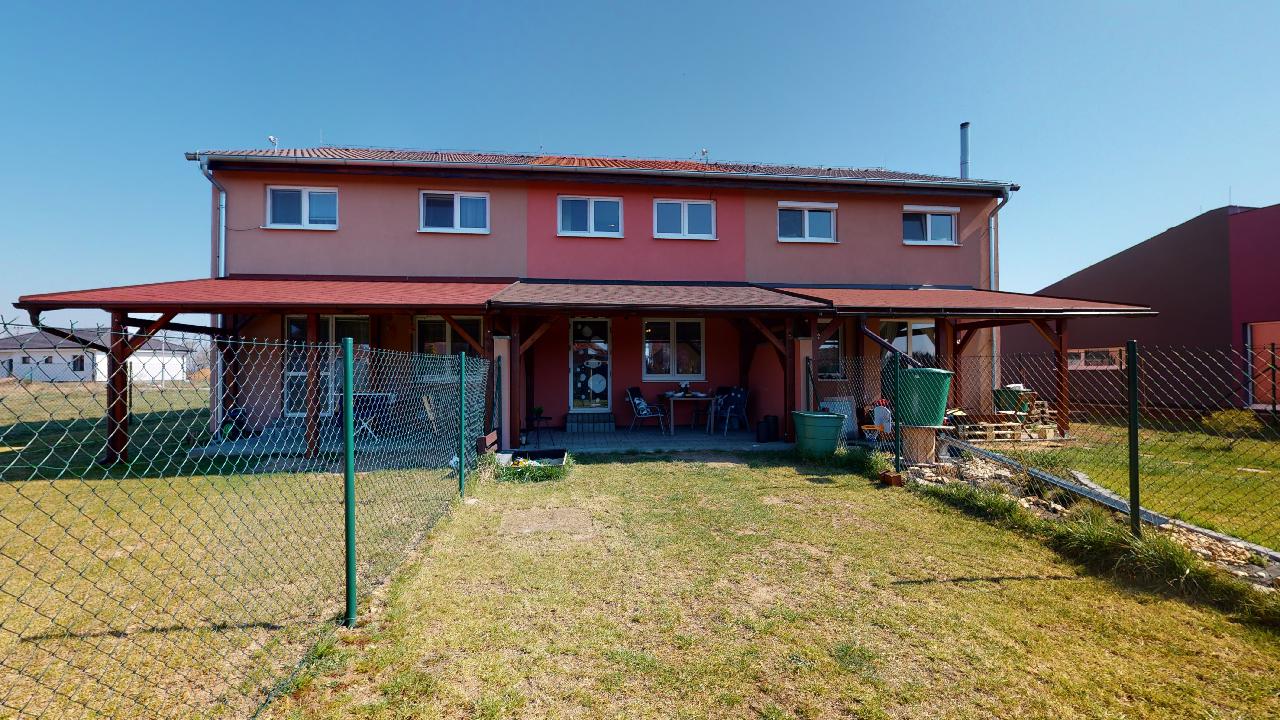 Už dlouho toužíte po klidném bydlení s vlastní zahrádkou mimo město, s nízkými provozními náklady a místo, kde byste mohli relaxovat a trávit volný čas s rodinou? Tak právě pro Vás je určena tato nemovitost. Jedná se o dvoupodlažní bytovou jednotku, dispozičně řešena jako 3+kk o obytné ploše 74m2 s parkovacím stáním pro dva osobní automobily, terasou s dřevěnou pergolou a zahrádkou s domkem na nářadí. V přízemí nemovitosti najdeme prostornou vstupní chodbu a komoru s dostatkem úložného prostoru. Dominantou tohoto bydlení je velkorysý obývací pokoj se vstupem na terasu a do zahrady. Kuchyňský kout je vybaven moderní linkou na míru s vestavěnými spotřebiči a nabízí dostatek prostoru s oknem pro šikovné hospodyňky či kuchaře. Dále je zde samostatná toaleta s umyvadlem, praktické řešení pro návštěvy budoucích majitelů. V 1. patře se nachází dva samostatné pokoje s oknem a také výhledem do zahrady. Pohodlí a soukromí je v tomto patře vyřešeno moderní koupelnou s vanou, umyvadlem a toaletou. Je zde dostatek prostoru pro pračku a sušičku. Vytápění nemovitosti a ohřev vody zajištuje elektrický kotel. Pro relaxaci novým majitelům poslouží terasa s dřevěnou pergolou pro příjemné posezení a nejen pro děti je určena zahrádka, která je nyní po celé ploše zatravněna. Na své si zde přijdou i domácí kutilové, kterým velmi dobře poslouží zahradní domek s pevně vybudovanými základy. Velmi nízké náklady na bydlení, 3.000,- Kč/měsíc. Energetická třída je B.