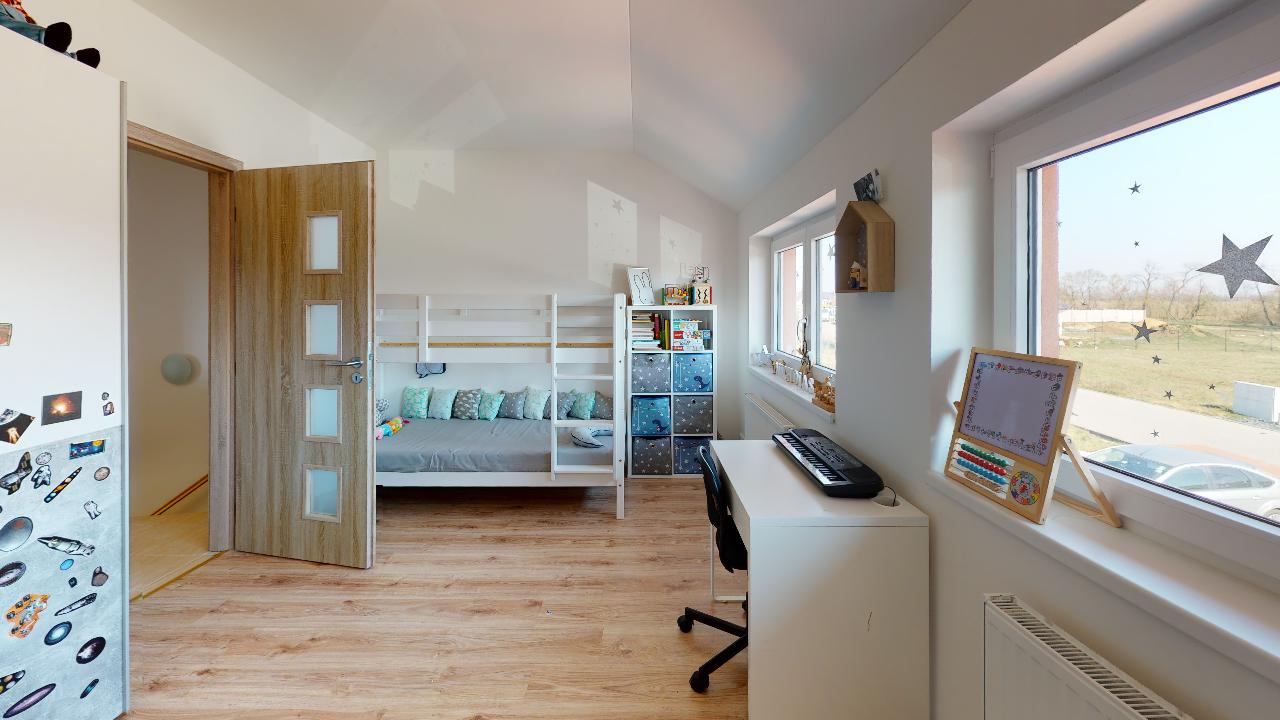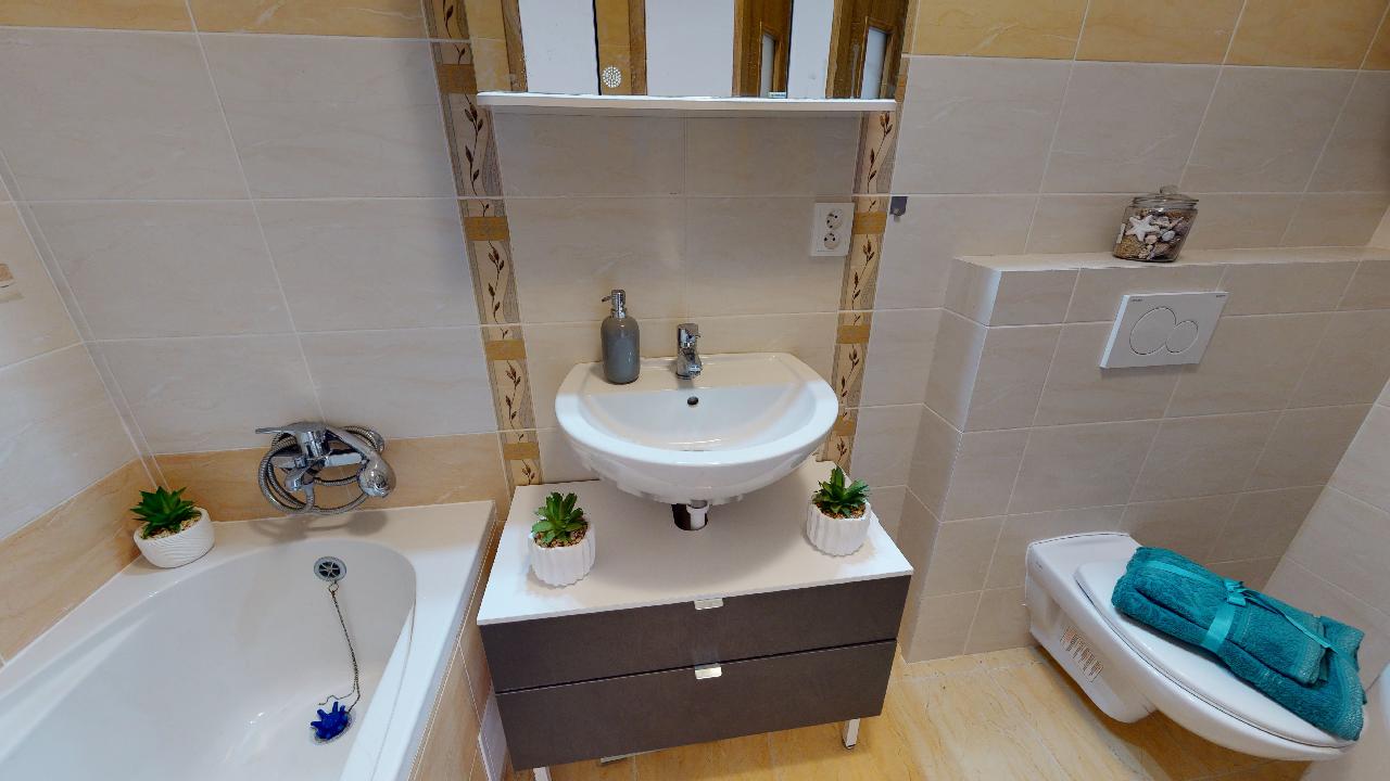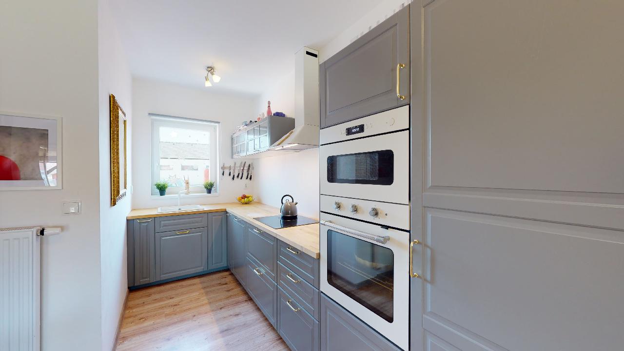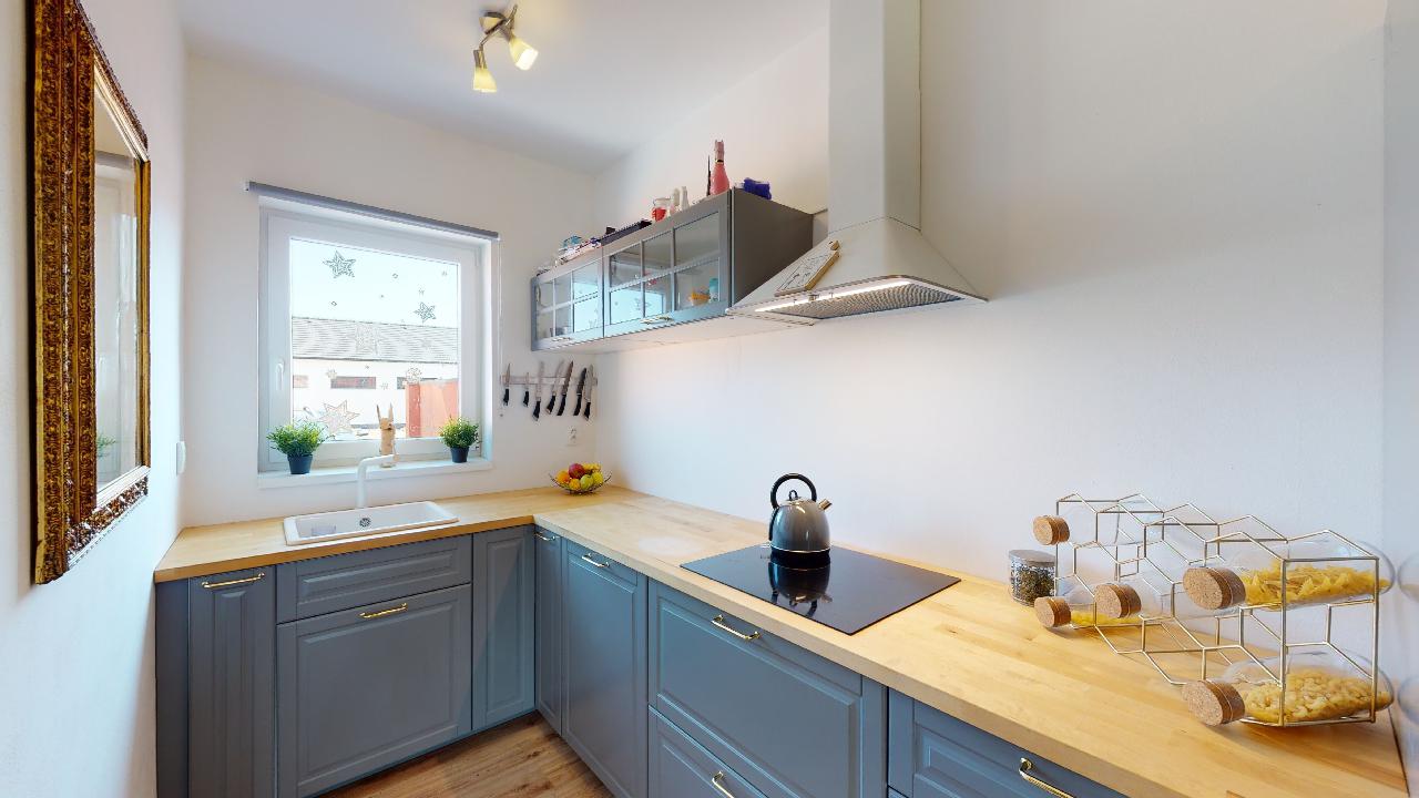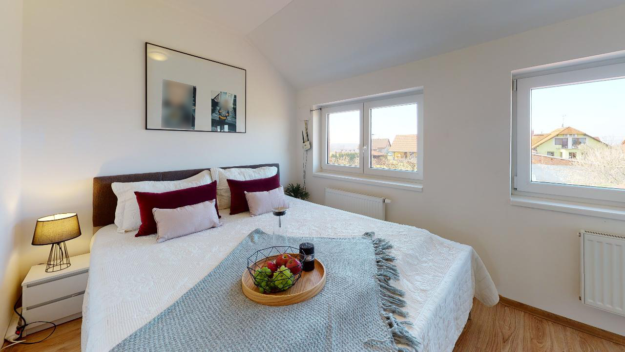 Už dlouho toužíte po klidném bydlení s vlastní zahrádkou mimo město, s nízkými provozními náklady a místo, kde byste mohli relaxovat a trávit volný čas s rodinou? Tak právě pro Vás je určena tato nemovitost. Jedná se o dvoupodlažní bytovou jednotku, dispozičně řešena jako 3+kk o obytné ploše 74m2 s parkovacím stáním pro dva osobní automobily, terasou s dřevěnou pergolou a zahrádkou s domkem na nářadí. V přízemí nemovitosti najdeme prostornou vstupní chodbu a komoru s dostatkem úložného prostoru. Dominantou tohoto bydlení je velkorysý obývací pokoj se vstupem na terasu a do zahrady. Kuchyňský kout je vybaven moderní linkou na míru s vestavěnými spotřebiči a nabízí dostatek prostoru s oknem pro šikovné hospodyňky či kuchaře. Dále je zde samostatná toaleta s umyvadlem, praktické řešení pro návštěvy budoucích majitelů. V 1. patře se nachází dva samostatné pokoje s oknem a také výhledem do zahrady. Pohodlí a soukromí je v tomto patře vyřešeno moderní koupelnou s vanou, umyvadlem a toaletou. Je zde dostatek prostoru pro pračku a sušičku. Vytápění nemovitosti a ohřev vody zajištuje elektrický kotel. Pro relaxaci novým majitelům poslouží terasa s dřevěnou pergolou pro příjemné posezení a nejen pro děti je určena zahrádka, která je nyní po celé ploše zatravněna. Na své si zde přijdou i domácí kutilové, kterým velmi dobře poslouží zahradní domek s pevně vybudovanými základy. Velmi nízké náklady na bydlení, 3.000,- Kč/měsíc. Energetická třída je B.