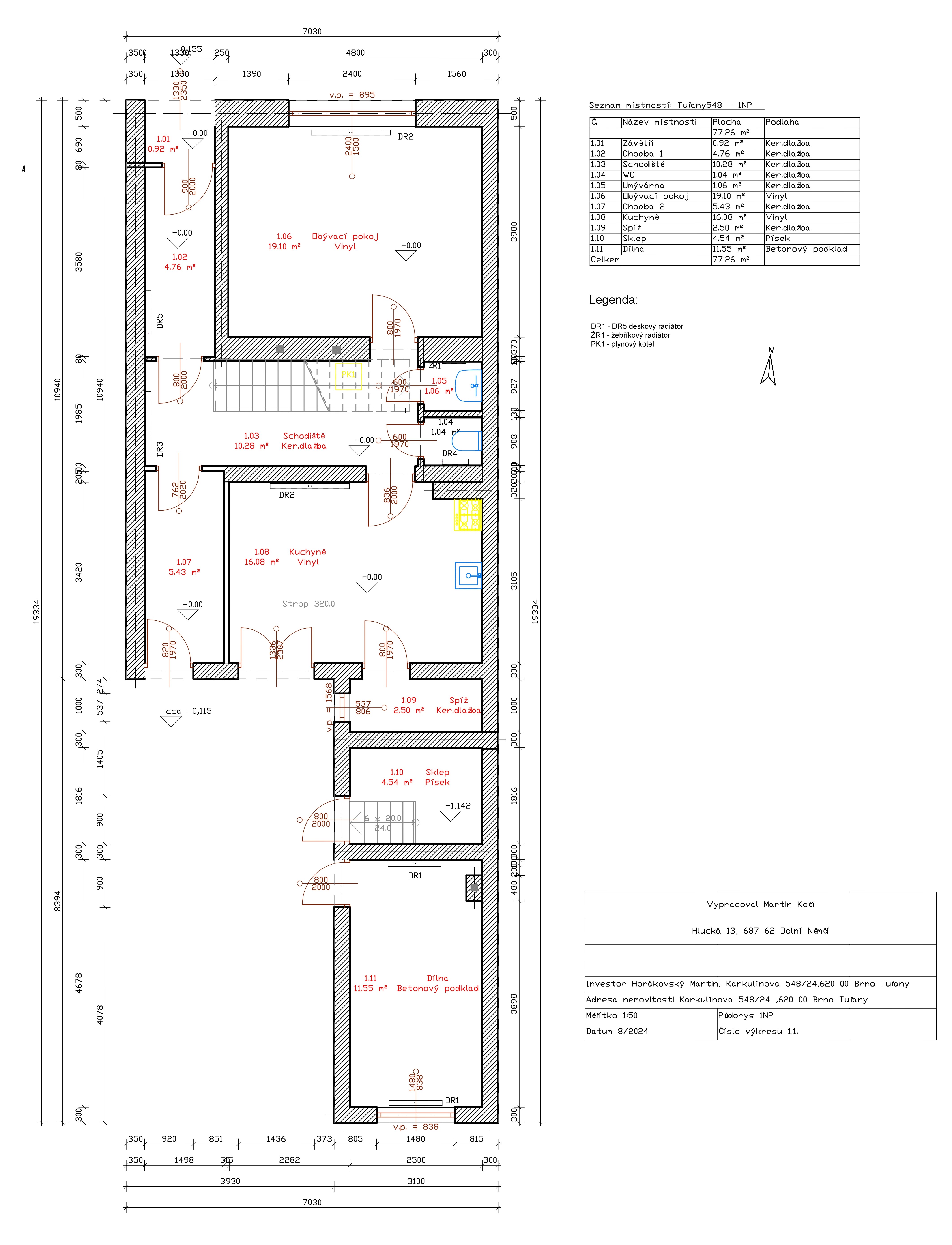 - 1. nadzemní podlaží (77,26m²): Zádveří 0,92 m², chodba 4,76 m², světlý obývací pokoj 19,10 m², schodiště 10,28 m², kuchyně se spíží 16,08 + 2,50 m², samostatná umývárna 1,06 m² a samostatné WC 1,04 m². Chodba 5,43 m², dvorek, dílna 11,55 m² a sklípek 4,54 m².