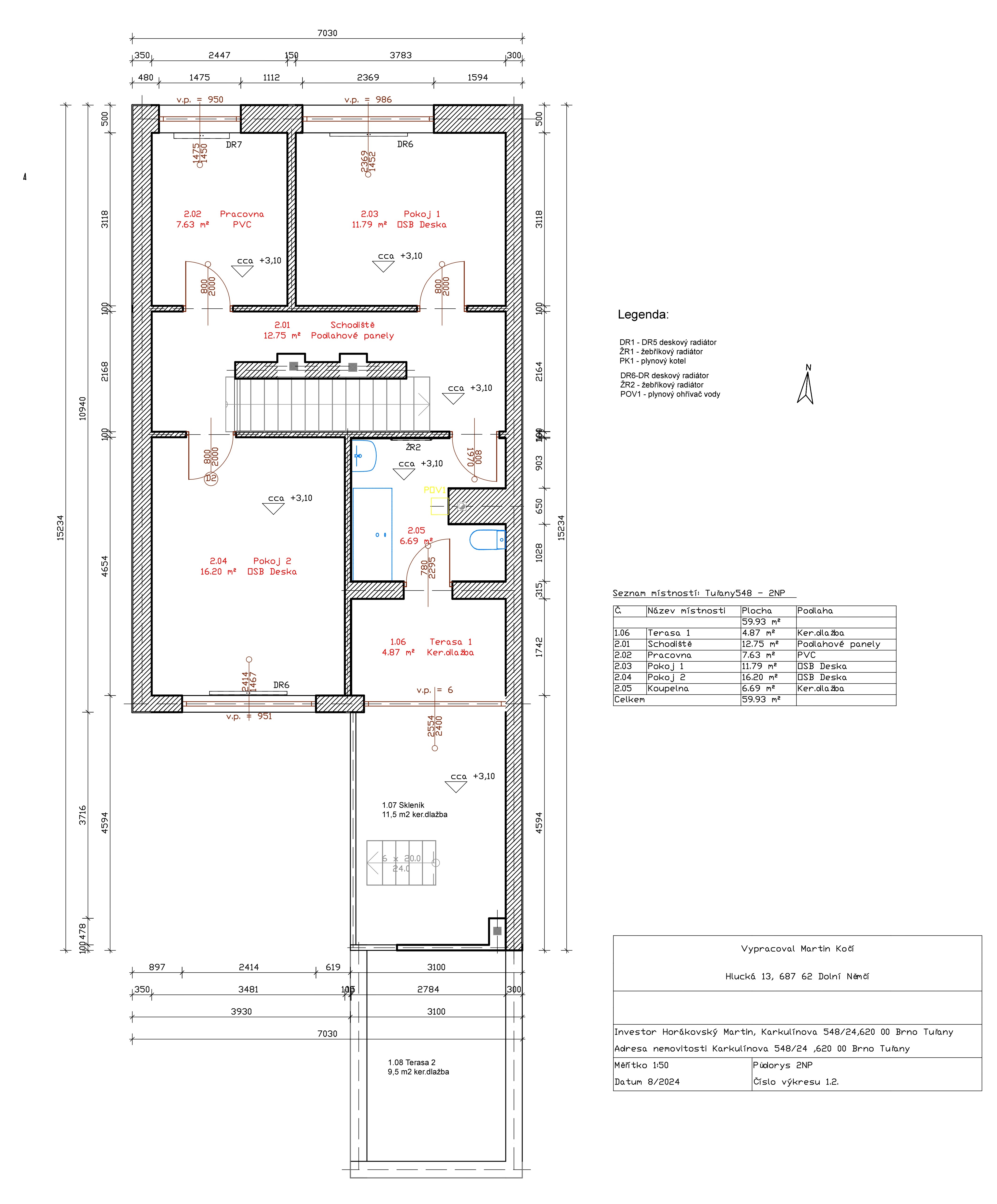 - 2. nadzemní podlaží (80,93m²): Tři samostatné pokoje – ložnice 16,20 m², pokoj 11,79 m², pokoj 7,63 m², koupelna s WC a bidetem 6,69 m², terasa krytá 4,87 m², terasa s výhledem 9,5 m² a skleník 11,5 m². Z koupelny máte přímý vstup na originální krytou terasu, kterou můžete upravit na saunu nebo relaxační prostor. Z něj se pak dostanete na střešní terasu, ideální pro chvíle odpočinku a relaxace.